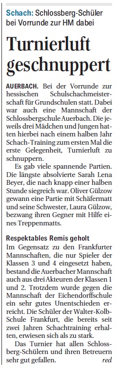 Am Jugendtraining der SG31 Bensheim nehmen auch 6 Grundschüler der Schlossbergschule Auerbach teil. Daher freuten sich die Kinder sehr, dass sie als Mannschaft der Schlossbergschule an der Vorrunde zur Hessischen Schulschachmeisterschaft in Frankfurt teilnehmen konnten.